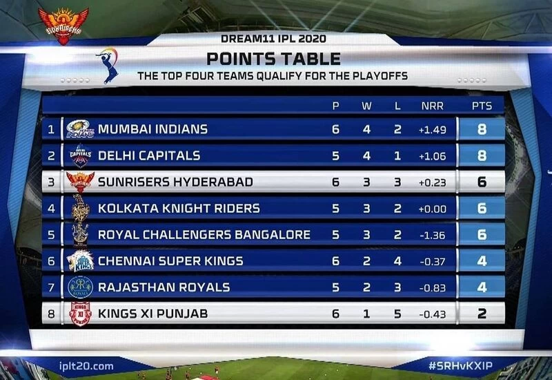IPL 2020: आईपीएल का रोमांच बरकरार है। सनराइजर्स हैदराबाद और किंग्स इलेवन पंजाब के बीच मुकाबले के बाद प्वाइंट्स टेबल में एक बार फिर से उलटफेर हुआ। हैदराबाद की जीत ने उसे प्वाइंट्स टेबल में तीसरे नंबर पर ला दिया है। वहीं लगातार चौथा मुकाबला हारने वाली पंजाब की टीम आखिरी पायदान है। पहले नंबर नेट रन रेट के आधार पर मुंबई इंडियंस का कब्जा है। दूसरे नंबर पर दिल्ली कैपिटल्स और चौथे नंबर पर कोलकाता नाइटराइडर्स काबिज है। मुंबई-दिल्ली ने चार-चार जबकि हैदराबाद, कोलकाता और बैंगलोर ने तीन-तीन मैच जीते हैं।