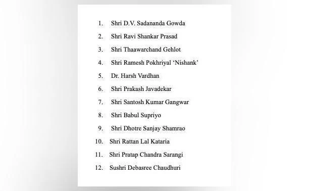 रविशंकर प्रसाद और प्रकाश जावड़ेकर को जहां कैबिनेट से बाहर कर दिया गया है तो हर्षवर्धन से स्वास्थ्य मंत्रालय छीन लिया गया है। राष्ट्रपति सचिवालय की विज्ञप्ति के अनुसार, ''प्रधानमंत्री के सुझाव पर भारत के राष्ट्रपति ने मंत्रिपरिषद के 12 सदस्यों का इस्तीफा तत्काल प्रभाव से स्वीकार कर लिया है।'' जिन मंत्रियों का इस्तीफा स्वीकार किया गया है, उनमें सदानंद गौड़ा, रविशंकर प्रसाद, थावरचंद गहलोत, रमेश पोखरियाल निशंक, डॉ. हर्षवर्द्धन, प्रकाश जावड़ेकर, संतोष कुमार गंगवार शामिल है। रविशंकर प्रसार के पास कानून मंत्रालय के साथ साथ सूचना प्रौद्योगिकी मंत्रालय था जबकि जावड़ेकर पर्यावरण मंत्रालय के साथ साथ सूचना एवं प्रसारण मंत्रालय का दायित्व संभाल रहे थे।