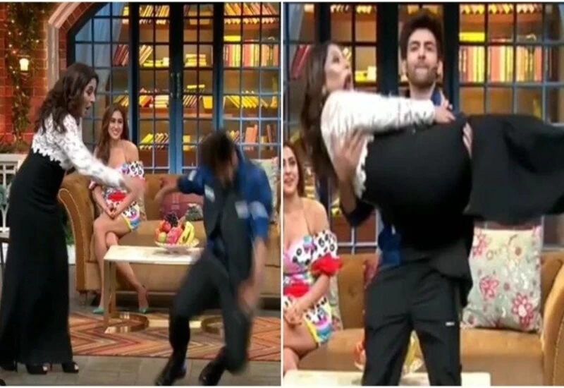 कपिल कार्तिक से सारा की बजाय अर्चना को गोद में उठाने का चैंलेंज देते हैं। कार्तिक भी कपिल शर्मा के इस चैलेंज को खुशी-खुशी पूरा कर देते हैं, लेकिन अर्चना को गोद में उठाने के बाद कार्तिक वहीं सेट पर ही गिर पड़ते हैं। हालांकि, ये सबकुछ एक मजाक था। कार्तिक भी मजाक में ही स्टेज पर गिर जाते हैं। इसके बाद वहां मौजूद सभी लोग जोर-जोर से हंसने लगते हैं।