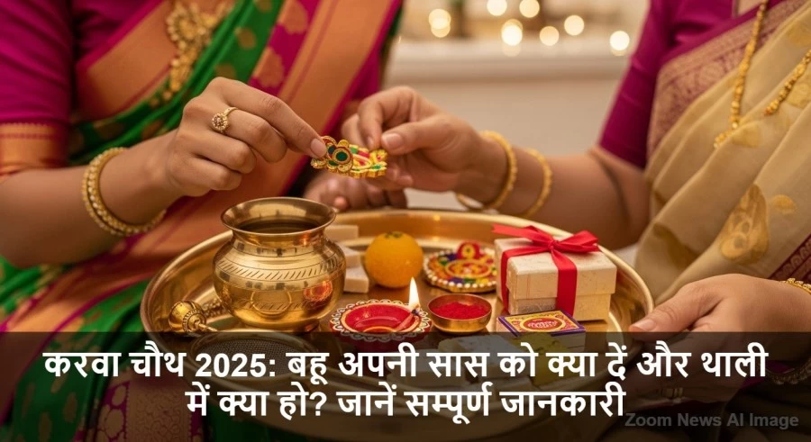 करवा चौथ की थाली में कुछ चीजें अनिवार्य रूप से होनी चाहिए:सुहाग का सामान: यह अखंड सौभाग्य का प्रतीक है और इसमें नई साड़ी या सूट (लाल, पीला, हरा या गुलाबी रंग शुभ), कांच या लाख की चूड़ियां (शुभ रंग की), सिंदूर, बिंदी, काजल, कंघा, नेलपॉलिश और लिपस्टिक शामिल होने चाहिए। मेहंदी/आलता: हाथों और पैरों को सजाने के लिए। मिठाई और सूखा मेवा: पारंपरिक मिठाई या सास की पसंदीदा मिठाई, साथ ही काजू, बादाम, किशमिश जैसे सूखे मेवे। आभूषण या अन्य उपहार: चांदी की पायल या बिछिया, शगुन के तौर पर नकद राशि, मिट्टी या पीतल का करवा, दीपक या नई चुनरी जैसी पूजा सामग्री भी दी जा सकती है। ये सभी वस्तुएं सास-बहू के रिश्ते को और भी मधुर बनाने में सहायक होती हैं।