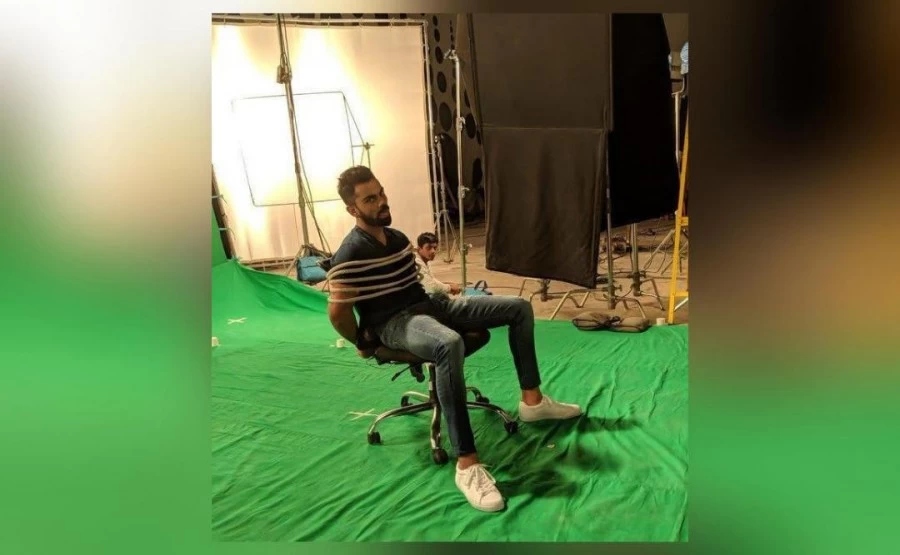 *तस्वीर में कुर्सी पर बैठे हुए विराट रस्सी से बंधे हुए हैं।