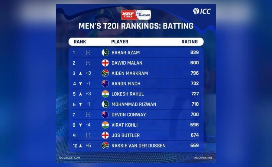 उन्हें सिर्फ पाकिस्तान और न्यूजीलैंड के खिलाफ ही पूरी तरह से बल्लेबाजी करने का मौका मिला। इसमें उन्होंने पाक के खिलाफ 57 और न्यूजीलैंड के खिलाफ 9 रन बनाए थे। इसके अलावा स्कॉटलैंड के खिलाफ उन्होंने नाबाद 2 रन बनाए। विराट का इस टी-20 वर्ल्ड कप में औसत 33 का रहा। आईसीसी ने ताजा टी-20 रैंकिंग जारी की है, इसमें पाकिस्तान के कप्तान बाबर आजम पहले की ही तरह नंबर वन की पोजीशन पर विराजमान हैं। इस रैंकिंग में दक्षिण अफ्रीका के एडेन मार्करम ने भी तीन पोजीशन का सुधार किया है और वे तीसरे नंबर पर हैं।