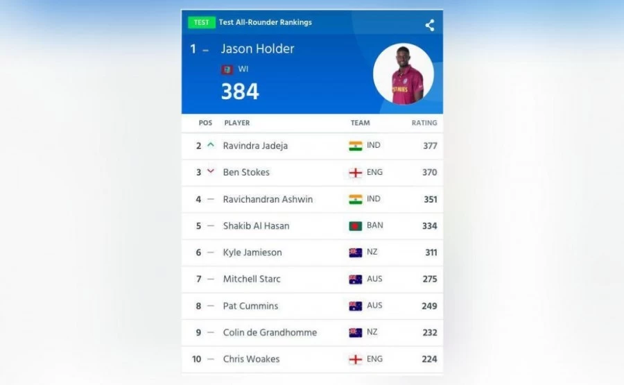 क्रिकेट: आईसीसी ने टेस्ट ऑल-राउंडर्स की ताज़ा रैंकिंग जारी की है जिसमें शीर्ष 5 में 2 भारतीय शामिल हैं। रविंद्र जडेजा एक पायदान ऊपर चढ़कर दूसरे स्थान पर आ गए हैं जबकि रविचंद्रन अश्विन चौथे नंबर पर बरकरार हैं। शीर्ष 10 में न्यूज़ीलैंड, ऑस्ट्रेलिया और इंग्लैंड के 2-2 खिलाड़ी शामिल हैं। वहीं, वेस्टइंडीज़ के जेसन होल्डर शीर्ष पर हैं।