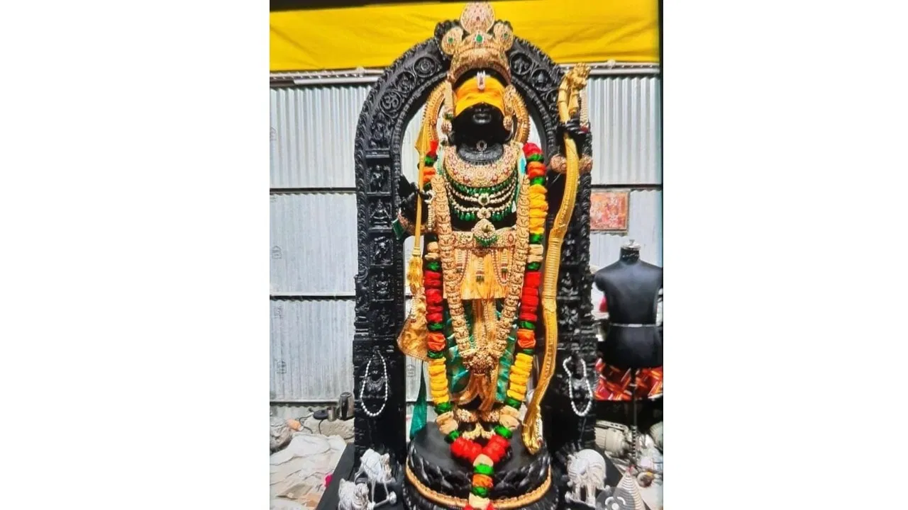 Ram Mandir Ayodhya: अयोध्या में 22 जनवरी को होने वाले प्राण-प्रतिष्ठा से पहले रामलला की संपूर्ण श्रृंगार की पहली तस्वीर सामने आ गई है. इससे पहले गुरुवार को रामलला की मूर्ति को गर्भगृह में स्थापित किया गया था. इस तस्वीर में श्रीराम के आंखों में पट्टी बंधी हुई है लेकिन उनका संपूर्ण श्रृंगार देखने लायक है. तस्वीर में श्रीराम के चेहरे पर मधुर मुस्कान और माथे पर तिलक मूर्ति को दिव्य और अलौकिक बना रहा है. मूर्ति में भगवान राम के हाथों में धनुष और बाण भी दिखाई दे रहा है.रामलला की मूर्ति पहली बार सामने आई है. रामलला की आंखों को पीले कपड़ों (पीतांबर) से ढका गया है. इस मूर्ति का सोने के आभूषण से श्रृंगार किया गया है. मैसूर के मूर्तिकार अरुण योगीराज की ओर से तैयार की गई 51 इंच की रामलाल की मूर्ति को गुरुवार की सुबह मंदिर में लाया गया था. कमल के फूल में विराजमान होने के बाद रामलला की इस मूर्ति की लंबाई 8 फीट हो जाती है. इस मूर्ति का वजन 150 से 200 किलोग्राम के करीब बताया जा रहा है. रामलाल की इस मूर्ति को श्याम शिला पत्थर से तैयार किया गया है.