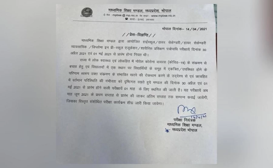 आपको बता दें कि राज्य क्लास पहली से आठवीं तक के स्कूल पहले ही बंद हैं। पहले के परीक्षा कार्यक्रम में हाईस्कूल की परीक्षा 30 अप्रैल 2021 से 19 मई 2021 तक और हायर सेकंडरी (Class 12) की परीक्षाएं 01 मई 2021 से 21 मई 2021 तक आयोजित होनी थी। Fआपको बता दें कि एमपी बोर्ड द्वारा संचालित 9वीं, 10वीं, 11वीं और 12वीं कक्षा के प्रैक्टिकल एग्जाम 15 अप्रैल 2021 से शुरू होने थे।