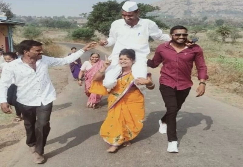 महाराष्ट्र में बीते सप्ताह 15 जनवरी को हुए हुए ग्राम पंचायत चुनाव के नतीजे सोमवार को आए, जिसमें 1.25 लाख उम्मीदवारों को जीत मिली है। इसी बीच जीत का जश्न मनाते हुए पुणे के एक गांव का वीडियो सोशल मीडिया पर वायरल हो गया। इस वीडियो में एक महिला अपने पति की जीत पर इतनी खुश दिख रही है कि उसने खुद पति को कंधों पर बिठा लिया। इतना ही नहीं, महिला ने पति को कंधे पर बिठाकर गांव भर में जूलूस निकाला।