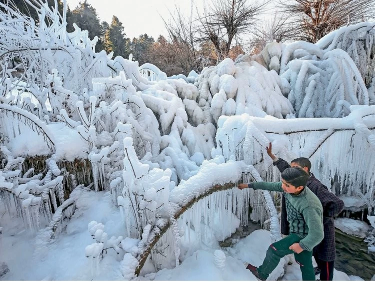 मध्य प्रदेश के बीना में ठंड के कारण पेड़ जमी बर्फ की चादर।