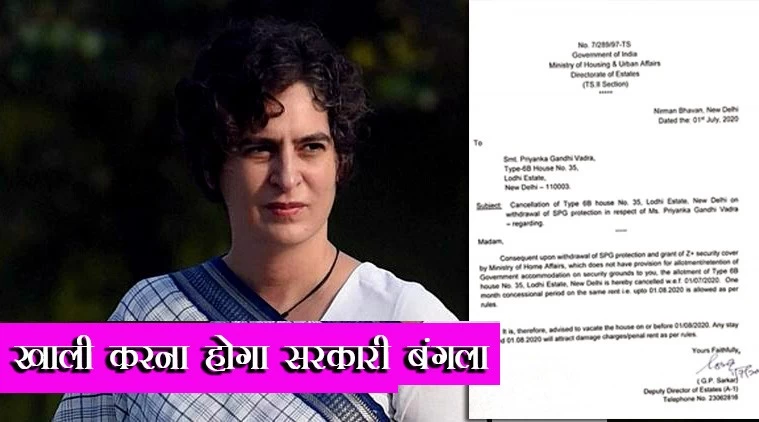 प्रियंका गांधी से एसपीजी सुरक्षा वापस ली गई थी और Z+ सुरक्षा दी गई थी। एसपीजी कवर में सुरक्षा के मद्देनजर सरकारी बंगले का प्रावधान था। Z+ में ऐसा कोई प्रावधान नहीं है। इसलिए अलॉटमेंट कैंसल किया जा रहा है। अगर 1 अगस्त तक बंगला खाली नहीं किया तो उसके बाद जुर्माने के तौर पर किराया लगेगा।