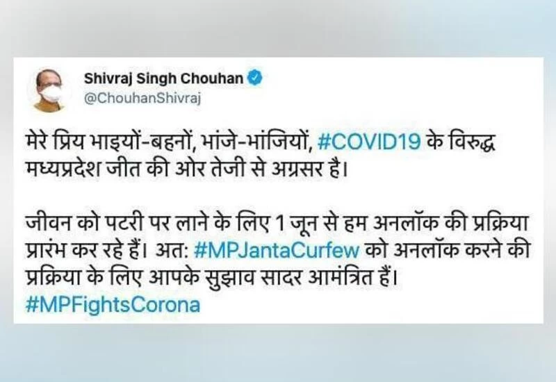 शिवराज चौहान ने आगे कहा कि मध्य प्रदेश जनभागीदारी का मॉडल है और इसी वजह से प्रदेश कोविड-19 को नियंत्रित करने में सफल रहा. उन्होंने कहा कि अभी मध्य प्रदेश में कोरोना जनता कर्फ्यू लागू है, लेकिन 1 जून से धीरे-धीरे अनलॉक करना है, ताकि पटरी पर जीवन आ सके. उन्होंने कहा कि संपूर्ण जिलों में कोरोना कर्फ्यू कैसे लागू होगा, अस्पतालों में व्यवस्थाएं कैसे सुदृढ़ होंगी यह जिला क्राइसिस मैनेजमेंट ग्रुप ने तय किया. यह एमपी का मॉडल है, जिसकी वजह से कोरोना नियंत्रण में आया.