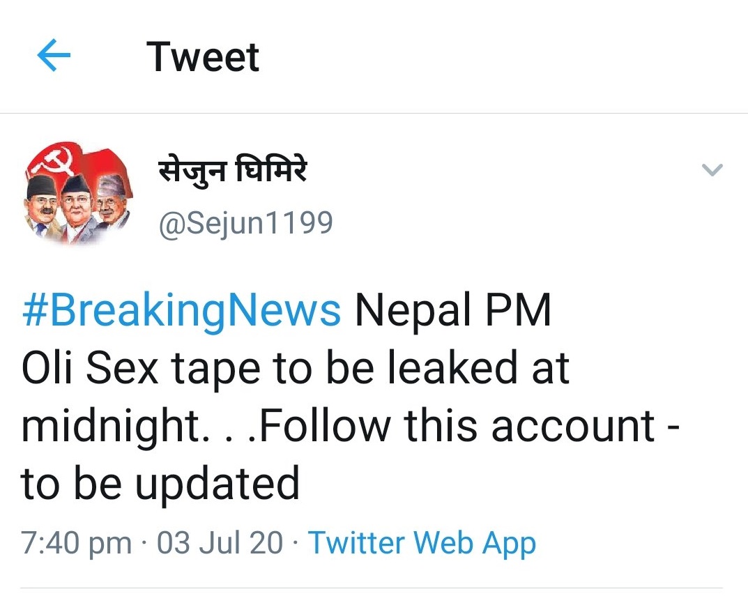 जाहिर है, दावा यही है कि इस फोटो में नेपाली पीएम हैं। यहां हम आपको बता दें कि zoom News इस दावे की पुष्टि नहीं करता है।लेकिन सबसे ज्यादा हैरानी की बात तो ये है कि इस ट्वीट और इसके पहले किए गए ऐलान वाले ट्वीट को कुछ ही देर में डिलीट भी कर दिया गया।माना यही जा रहा है कि नेपाली कम्युनिस्ट पार्टी में ओली विरोधी खेमे ने उनपर दबाव बनाने के लिए एक फोटो लीक की थी। पूरा सेक्स टेप रिलीज करने से पहले ही दोनों खेमों में कोई डील हो गई है।