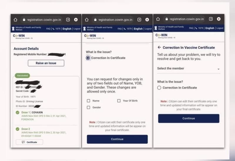 केंद्रीय स्वास्थ्य मंत्रालय के अतिरिक्त सचिव विकास शील ने बुधवार को बताया कि उपयोगकर्ता कोविन वेबसाइट के जरिए यह सुधार कर सकते हैं। आरोग्य सेतु ऐप के आधिकारिक हैंडल पर एक ट्वीट किया गया, अगर कोविन टीकाकरण प्रमाण-पत्रों में अनजाने में आपके नाम में, जन्मतिथि में और लिंग में कोई त्रुटि हुई है तो आप उन्हें ठीक कर सकते हैं। कोविन की वेबसाइटट पर जाएं और इस संबंध में अपनी समस्या बताएं।