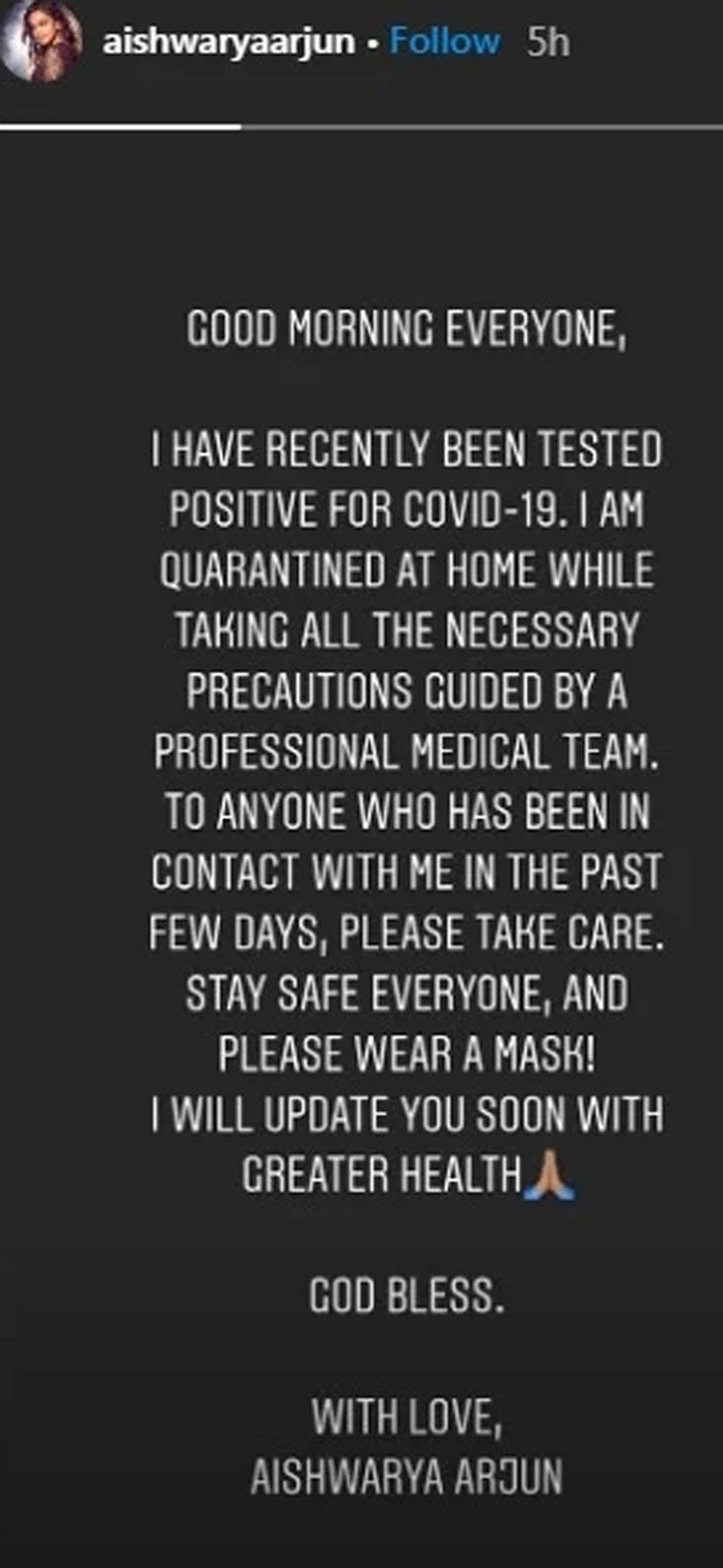 बता दें, ऐश्वर्या अर्जुन कोविड-19 की जांच में पॉजिटिव पाई गई हैं और फिलहाल अपने घर पर क्वारंटाइन में हैं। उन्होंने सोमवार को अपने इंस्टाग्राम अकाउंट पर इस बात की पुष्टि की। अभिनेत्री ने लिखा, 'मैं हाल ही में कोविड-19 पॉजिटिव पाई गई हूं। पेशेवर मेडिकल टीम द्वारा निर्देशित सभी आवश्यक सावधानियां बरतते हुए घर पर क्वारंटाइन में हूं।' उन्होंने आगे लिखा, 'पिछले कुछ दिनों में जो भी मेरे संपर्क में आए हैं, वे कृपया अपना ख्याल रखें। सभी सुरक्षित रहें और कृपया मास्क पहनें! मैं आपको जल्द ही अच्छे स्वास्थ्य की जानकारी दूंगी। ईश्वर कृपा बनाए रखें। सादर, ऐश्वर्या अर्जुन।" ऐश्वर्या मशहूर तमिल, तेलुगू और कन्नड़ अभिनेता-फिल्मकार अर्जुन सरजा की बेटी हैं, जिन्हें लोग 'एक्शन किंग' के नाम से जानते हैं।