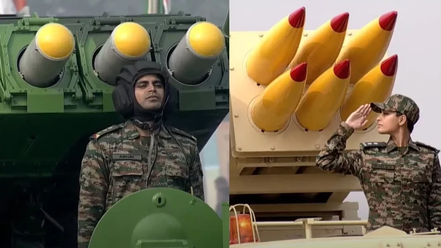 गणतंत्र दिवस परेड में कर्तव्य पथ पर भारत में निर्मित उन्नत किस्म के पिनाका रॉकेट सिस्टम का भा प्रदर्शन किया गया है। बता दें कि पिनाका रॉकेट सिस्टम 44 सेकेंड में 12 रॉकेट दागने में सक्षम है। इसकी रेंज 90 किलोमीटर तक की है और इसे और शक्तिशाली बनाया जा रहा है। कई देशों ने इस हथियार में दिलचस्पी दिखाई है।