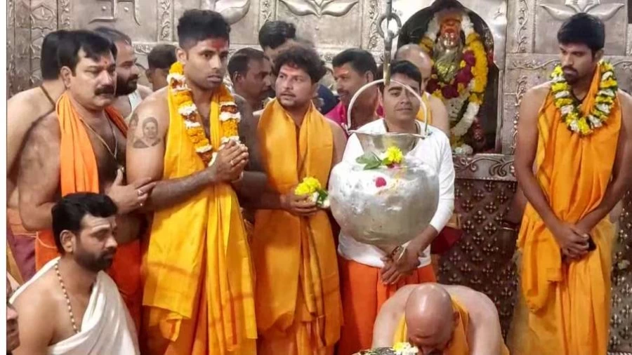 मध्य प्रदेश: भारतीय क्रिकेटर सूर्यकुमार यादव, कुलदीप यादव और वॉशिंगटन सुंदर ने उज्जैन के महाकालेश्वर मंदिर में पूजा की।