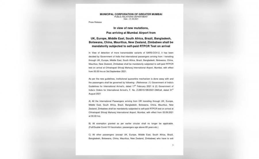 1. यूके, यूरोप, मध्यपूर्व, दक्षिण अफ्रीका, ब्राजील, बांग्लादेश, बोत्सवाना, चीन, मॉरीशस, न्यूजीलैंड, जिम्बाब्वे से सीधे या इन देशों से होकर मुंबई के छत्रपति शिवाजी महाराज इंटरनेशनल एयरपोर्ट पर उतरेंगे, उन सभी यात्रियों को एयरपोर्ट पर उतरने के बाद अपने खर्चे से RT-PCR टेस्ट करवाना ज़रूरी होगा. 3 सितंबर 2021 की आधी रात से यह नियम लागू हो जाएगा.