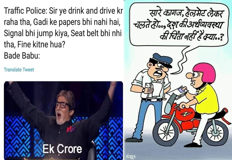 अगर सीट बेल्ट बिना लगाए बैठते हैं तो पहले 100 रूपए देने पड़ते थे अब आपको 1000 रूपए देने पड़ेंगे। 'रेड लाइट' जंप करने के दौरान 1000 रूपए के बदले आपको 5000 रूपए देने पड़गे। शराब पीकर गाड़ी चलाते पकड़े गए तो 1000 रूपए नहीं बल्कि अब यह जुर्माना बढ़कर 10,000 हो गया है। जैसे ही यह ट्रैफिक रूल्स को लेकर नए नियम आए वैसे ही सोशल मीडिया पर फनी मीम्स ट्विटर पर ट्रेंड करने लगे।
