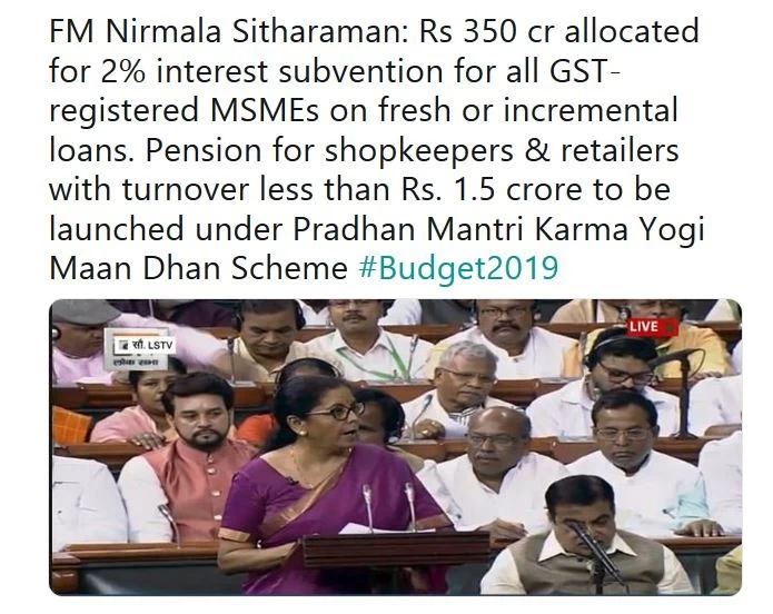 एफएम निर्मला सीतारमण: ताजा या वृद्धिशील ऋणों पर सभी जीएसटी-पंजीकृत एमएसएमई के लिए 2% ब्याज उपबंध के लिए आवंटित 350 करोड़ रुपये। रुपये से कम टर्नओवर वाले दुकानदारों और खुदरा विक्रेताओं के लिए पेंशन। प्रधानमंत्री कर्म योगी मान धन योजना बजट 2019 के तहत लॉन्च किए जाने वाले 1.5 करोड़
