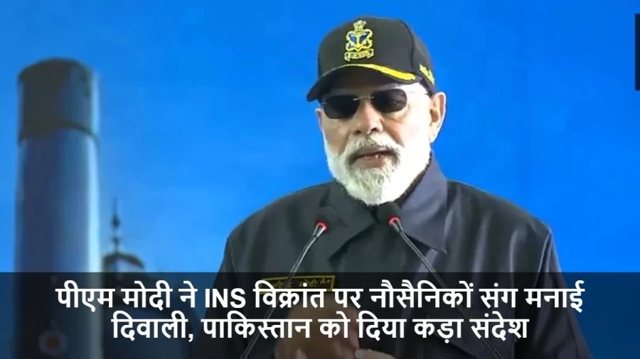 INS विक्रांत से पीएम मोदी ने पाकिस्तान को कड़ा संदेश दिया और उन्होंने कहा कि हमारी तीनों सेनाओं के बीच असाधारण समन्वय ने पाकिस्तान को रिकॉर्ड समय में घुटने टेकने पर मजबूर कर दिया। उन्होंने सशस्त्र बलों के बहादुर जवानों को सलाम किया और कहा कि जब खतरा वास्तविक। हो, तो लाभ उन्हीं को मिलता है जो अपनी ताकत पर डटे रहकर लड़ सकते हैं। उन्होंने 'विक्रांत' नाम का जिक्र करते हुए कहा कि इसने अपने नाम से ही पूरे पाकिस्तान की नींद उड़ा दी थी और यह आत्मनिर्भर भारत का बहुत बड़ा प्रतीक है।