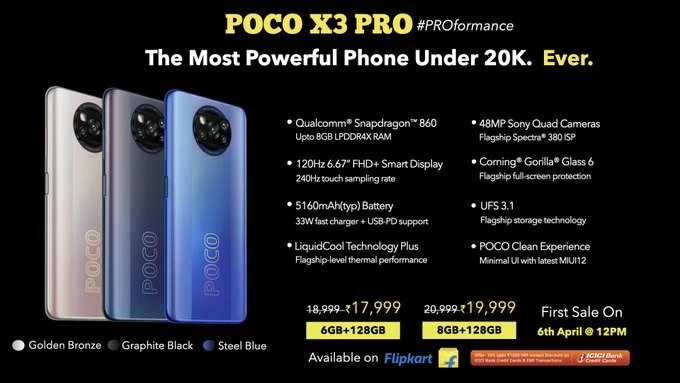 Poco X3 Pro की कीमत भारत में 18,999 रुपये से शुरू होती है, जो कि इसके 6 जीबी रैम + 128 जीबी स्टोरेज वेरिएंट की कीमत है। वहीं, इसके 8 जीबी रैम + 128 जीबी स्टोरेज वेरिएंट की कीमत 20,999 रुपये है। यह फोन गोल्डन ब्रॉन्ज, ग्रेफाइट ब्लैक और स्टील ब्लू कलर ऑप्शन के साथ खरीदा जा सकता है। Poco X3 Pro को दोपहर 12 बजे Flipkart से खरीदा जा सकता है। लॉन्च ऑफर्स की बात करें, तो पोको एक्स3 प्रो स्मार्टफोन को ICICI Bank क्रेडिट या फिर EMI ट्रांजैक्शन करने वाले ग्राहकों को 1,000 रुपये का इंस्टेंट डिस्काउंट मिल रहा है।