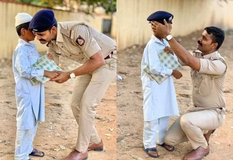 दरअसल इन तस्वीरों में एक पुलिस अधिकारी किसी छोटे बच्चे के साथ दिखाई दे रहे हैं। पहनावे से बच्चा मुसलमान नजर आ रहा है। तस्वीरों में दिख रहे पुलिसकर्मी का नाम महंतेश बनप्पागौदर है। महंतेश कर्नाटक पुलिस में इंसपेक्टर हैं।