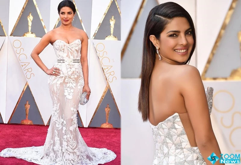 प्रियंका चोपड़ा ने पिछले ऑस्कर अवार्ड्स के समय की अपनी फोटो सोशल मीडिया पर शेयर की है। इस ड्रेस में उन्होंने सफ़ेद रंग का शीयर गाउन पहना हुआ है। यह गाउन काफी डीप नेक कट वाला है। इसके साथ ही प्रियंका ने इस ड्रेस के साथ एक साथ में छोटा सा क्लच पर्स कैरी किया है। और हाथ में 2 रिंग्स कैरी की हैं। इस ड्रेस पर उन्होंने बालों को खुला छोड़ने की जगह पीछे करके पोनी टेल बनाई हुई है। कानों में उन्होंने ओस की बूंदों की तरह क्रिस्टल के इयररिंग्स पहने हैं। प्रियंका ने अपने लिप्स को डार्क मैरून कलर की लिप्सटिक से सजाया है।