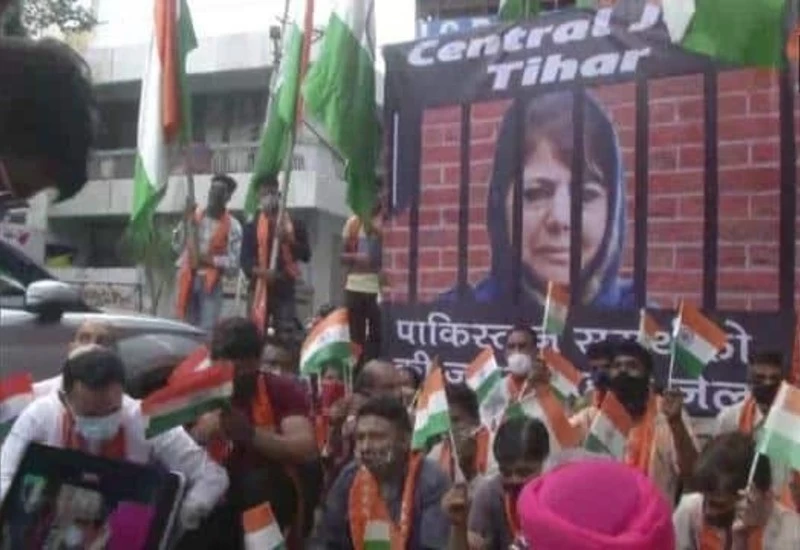 जम्मू-कश्मीर के मामले में पाकिस्तान को भी बातचीत में शामिल करने के महबूबा मुफ्ती के प्रस्ताव का जम्मू में विरोध शुरू हो गया है। गुरुवार को जम्मू में डोगरा फ्रंट नाम के संगठन से जुड़े लोग सड़कों पर उतरे और महबूबा मुफ्ती के खिलाफ विरोध प्रदर्शन किया। यही नहीं प्रदर्शनकारियों ने मांग की कि इस बयान के लिए महबूबा को जेल के अंदर डाला जाना चाहिए। एक प्रदर्शनकारी ने कहा, 'यह आंदोलन महबूबा मुफ्ती के बयान के खिलाफ है, जो उन्होंने गुपकार गठबंधन दलों की मीटिंग के बाद दिया था। उनका कहना था कि कश्मीर के मसले पर पाकिस्तान भी एक पार्टी है और उससे बातचीत की जानी चाहिए। उन्हें इस बयान के लिए जेल भेजा जाना चाहिए।'