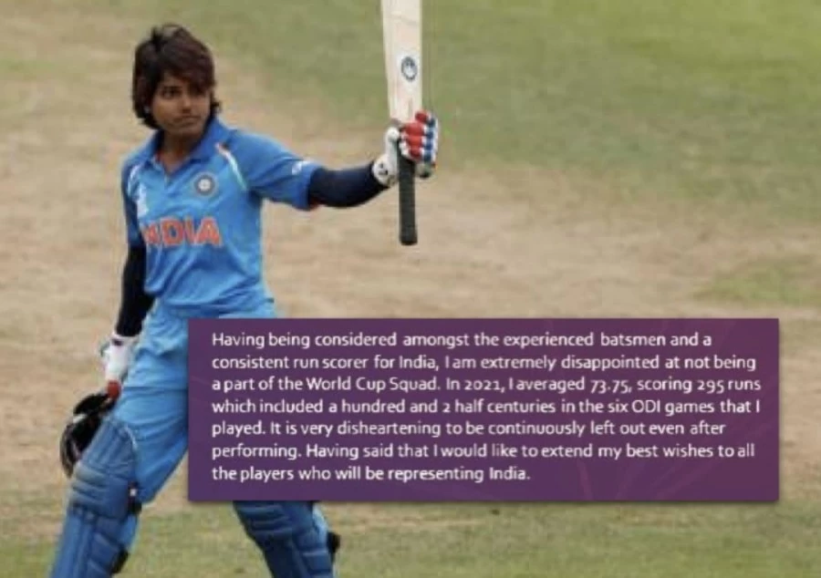 अनुभवी बल्लेबाजों में से एक और भारत के लिए लगातार रन बनाने वाले खिलाड़ी के रूप में, मैं वर्ल्ड कप टीम का हिस्सा नहीं होने से बेहद निराश हूं। 2021 में, मैंने 6 मैचों में 295 रन 73.75 की औसत से बनाये, जिसमें एक शतक और दो अर्धशतक शामिल थे। प्रदर्शन करने के बाद भी लगातार बाहर रहना बहुत निराशाजनक है। मैं उन सभी खिलाड़ियों को अपनी शुभकामनाएं देना चाहती हूं जो भारत का प्रतिनिधित्व करेंगे।