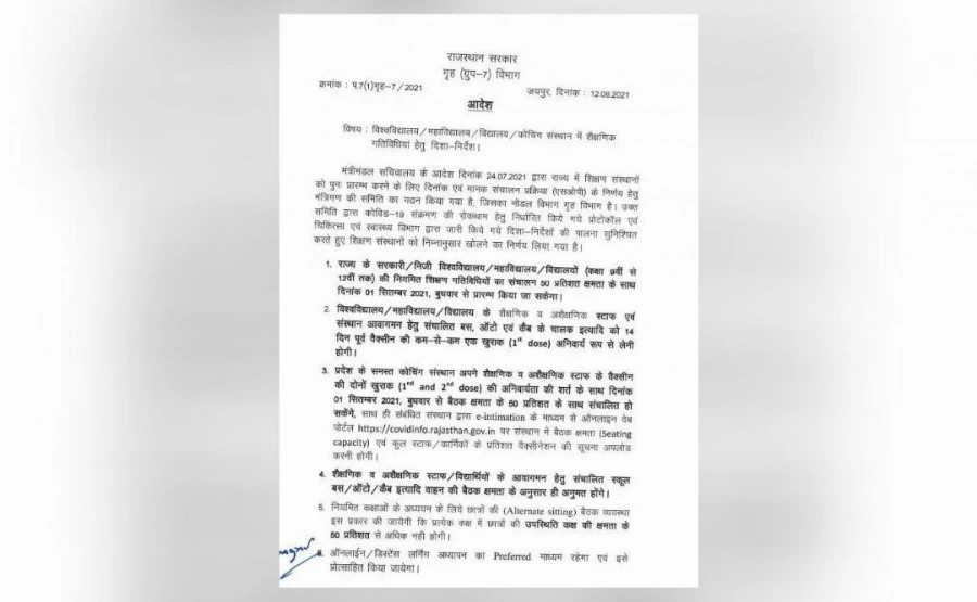 बता दें कि पिछले कई दिनों से राजस्थान में स्कूल को खोलने को लेकर मंथन चल रहा था। इस मुद्दे पर बनी मंत्रियों की कमेटी ने चर्चा के बाद अपनी रिपोर्ट मुख्यमंत्री को सौंपने की बात कही थी। कई मीडिया रिपोर्ट में यह भी कहा गया है कि अगस्त महीने में ही कॉलेज और यूनिवर्सिटी स्तर की संस्थाओं में ऑफलाइन पढ़ाई शुरू हो सकती है।