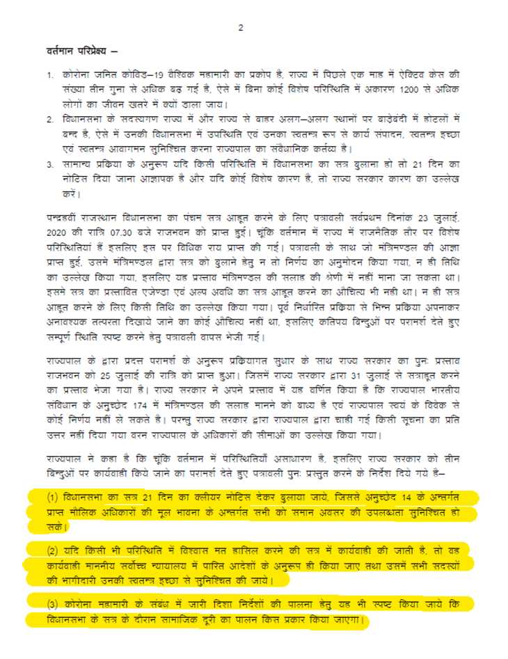 1. विधानसभा का सत्र 21.दिन का क्लीयर नोटिस देकर बुलाया जाए, जिससे विधानसभा के सभी सदस्यों को सत्र में आने के लिए बराबर समय और मौका मिलना तय हो सके।