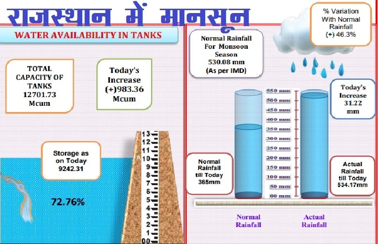 राजस्थान के 19 वर्षा मापक केन्द्रों पर अत्यधिक भारी वर्षा रिकार्ड की गई है। 66 जगहों पर अत्यधिक और 233 केन्द्रों पर सामान्य बारिश रिकार्ड हुई है। बीते चौबीस घंटों में राजस्थान के 48 बांधों पर चादर चलनी शुरू हुई है। प्रदेश के वृहद, मध्यम और छोटे बांधों में करीब 75 प्रतिशत पानी आ चुका है और बहुत तेज गति से पानी की आवक जारी है। जयपुर, अजमेर, टोंक को सप्लाई करने वाला बीसलपुर बांध भर चुका है। वहीं पश्चिमी राजस्थान की जीवनरेखा माने जाने वाला जवाई बांध भी लगातार भर रहा है। भीलवाड़ा व जोधपुर में दो—दो व अलवर में वर्षाजनित हादसों में एक मौत का समाचार है। चम्बल नदी खतरे के निशान से काफी उपर बह रही है और पानी पुल को छूने से थोड़ा ही नीचे है।