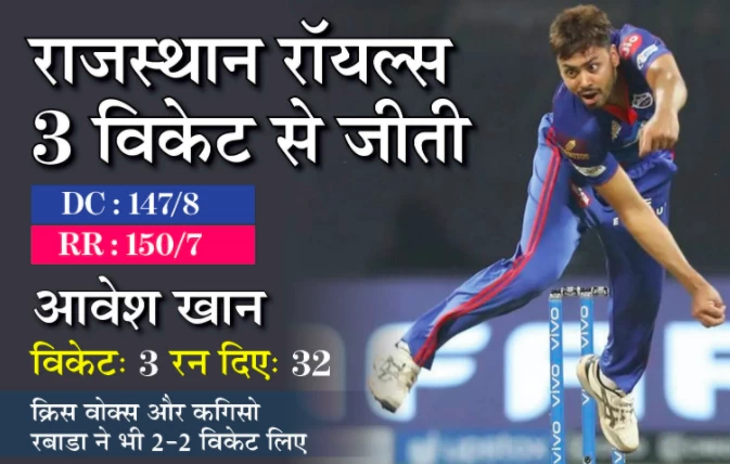 टॉस हारकर पहले बल्लेबाजी करते हुए दिल्ली ने दिल्ली कैपिटल्स ने 8 विकेट गंवाकर 147 रन बनाए। जवाब में राजस्थान (Rajasthan Royals ) की टीम ने 7 विकेट गंवाकर 150 रन बनाते हुए मैच अपने नाम कर लिया। डेविड मिलर ने 43 बॉल पर 62 रन की पारी खेली। डेविड मिलर ने IPL में अपनी 10वीं फिफ्टी लगाई। दिल्ली के लिए आवेश खान ने 32 रन देकर 3 विकेट लिए।