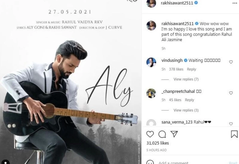 पोस्ट से जाहिर है कि यह गाना 'राहुल वैद्य एंटरनेटमेंट' के बैनर तले बना है। राहुल ने ही गाना गाया है और इसे संगीत दिया है। सबसे दिलचस्प बात यह है कि राखी सावंत और अली गोनी ने मिलकर यह गाना लिखा है, जिससे एक्ट्रेस के फैंस गाने को लेकर कुछ ज्यादा ही उत्साहित हो गए हैं। एक्ट्रेस के फैंस के अलावा उनके सेलेब्स ने भी उनकी पोस्ट पर कमेंट किए हैं। विंदू दारा सिंह ने कमेंट बॉक्स में लिखा है, 'इंतजार है।।' फैंस ने दिल के इमोजी शेयर करते हुए अपनी एक्साइटमेंट जाहिर की है।