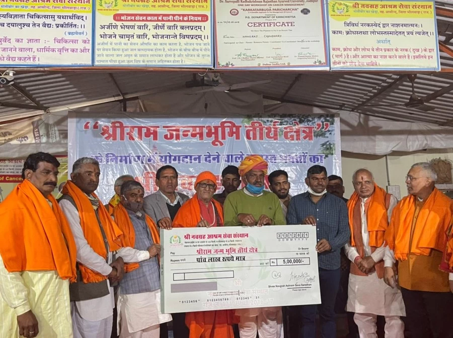 भीलवाड़ा । भीलवाड़ा के नवग्रह आश्रम में निधि समर्पण कार्यक्रम में राम मंदिर के प्रति आस्था का ज्वार उमड़ा। यहां नवग्रह आश्रम मोतीबेर का खेड़ा में एक समारोह आयोजित कर दानदाताओं का अभिनंदन किया गया।