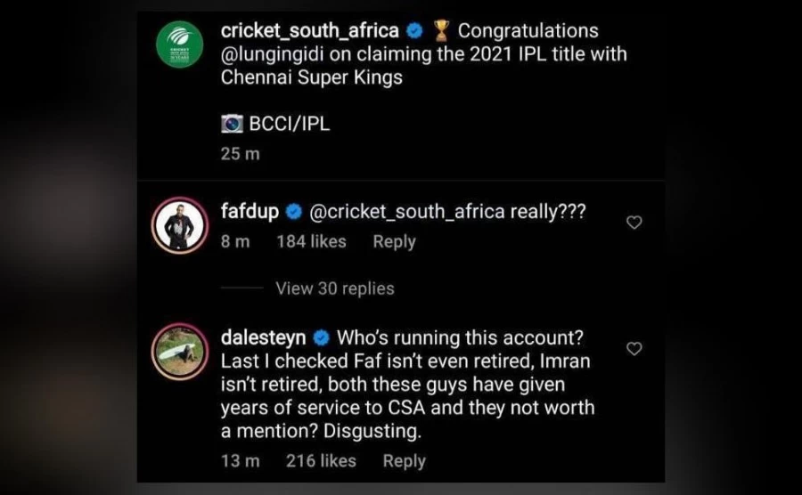 डेल स्टेन ने पोस्ट पर लिखा कि, “यह अकाउंट कौन चला रहा है? मैंने चेक किया फाफ ने संन्यास भी नहीं लिया है, अभी तक और इमरान ताहिर ने भी संन्यास नहीं लिया है। दोनों ही खिलाड़ियों ने कई सालों तक दक्षिण अफ्रीका की सेवा की है और उनके नाम का कोई उल्लेख भी नहीं कर रहा है। ये बहुत खराब है।”