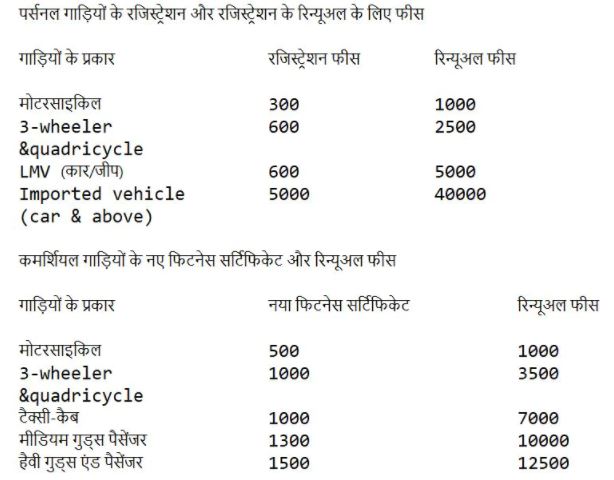 इसी तरह, पुरानी बाइक के रजिस्ट्रेशन और रिन्यूअल के लिए अगले साल अप्रैल से 1000 रुपए खर्च करने पड़ेंगे जबकि अब तक 300 रुपए में काम हो जाता था. उसी तरह बस और ट्रक के मामले में देखें तो फिटनेस रिन्यूअल सर्टिफिकेट के लिए 12500 रुपए खर्च करने होंगे. अभी इसके लिए 1500 रुपए लगते हैं. प्राइवेट गाड़ियों के रजिस्ट्रेशन के रिन्यूअल में देरी पर हर महीने 300 रुपये लगेंगे. कमर्शियल गाड़ियों के मामले में हर महीने 500 रुपये का पेमेंट करना होगा. कमर्शियल गाड़ियों(vehicles) के फिटनेस सर्टिफिकेट में देरी पर हर दिन 50 रुपए के हिसाब से जुर्माना लगेगा.फीस बढ़ाने का उद्देश्य लोगों को पुरानी गाड़ियां(vehicles) चलाने से दूर रखना है. 15 साल पुरानी प्राइवेट गाड़ियों के मामले में मालिक को हर 5 साल में रजिस्ट्रेशन को रिन्यू कराना अनिवार्य होगा. इसी तरह, कमर्शियल गाड़ियों के मामले में 8 साल पूरे होने के बाद हर साल फिटनेस सर्टिफिकेट का रिन्यूअल अनिवार्य है. नोटिफिकेशन में वाहनों के मैनुअल और ऑटोमैटिक फिटनेस टेस्ट के लिए फीस भी निर्धारित की गई है. सरकार का लक्ष्य फिटनेस जांच की मैनुअल प्रणाली को खत्म करना है, जिसमें हेरफेर या धांधली की संभावना बनी रहती है.पीएम ने लॉन्च की थी योजनाप्रधानमंत्री नरेंद्र मोदी ने अगस्त में नेशनल ऑटोमोबाइल स्क्रैपिंग पॉलिसी लॉन्च की थी. पीएम ने कहा था कि देश में अनफिट वाहनों को वैज्ञानिक तरीके से हटाने में ये नीति बड़ी भूमिका निभाएगी. पीएम ने इस नीति के चार फायदे भी गिनाए थे-