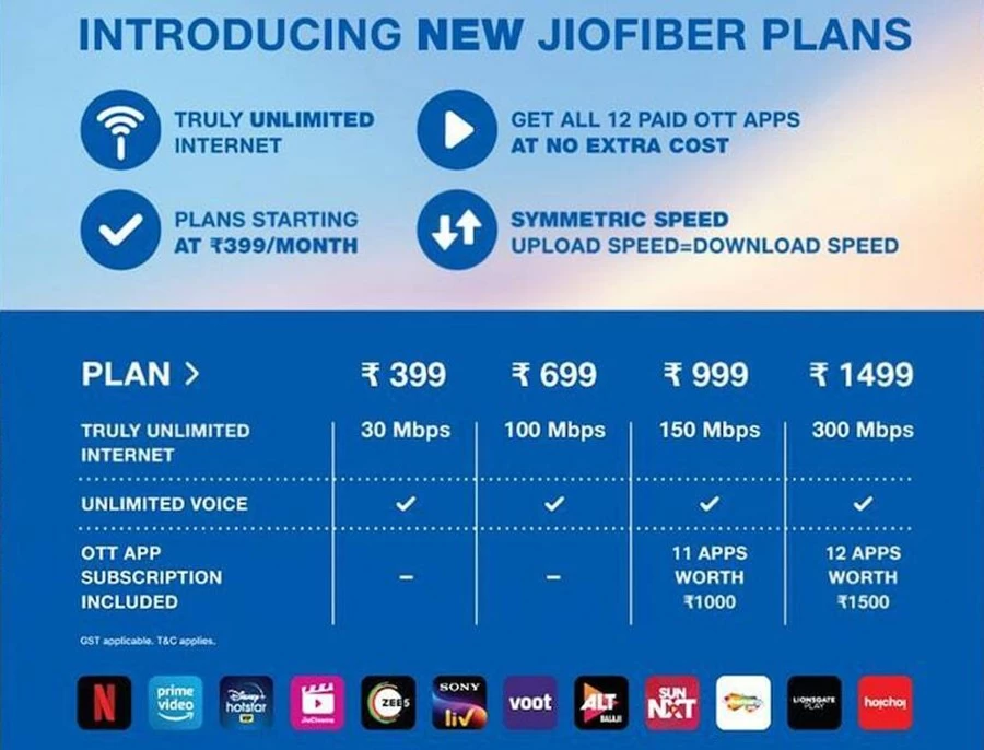 999 Jio Fiber Gold Plan में 150 एमबीपीएस तक की स्पीड से डेटा मिलेगा। अनलिमिटेड वॉयस कॉल की सुविधा होगी। इसके अलावा 1,000 रुपये का 11 ओटीटी ऐप्स का सब्सक्रिप्शन मुफ्त होगा। ग्राहकों को 1,499 रुपये का जियो फाइबर डायमंड प्लान में 300 एमबीपीएस की स्पीड से डेटा मिलेगा। इसमें अनलिमिटेड वॉयस कॉल की सुविधा के साथ 1,500 रुपये का 12 ओटीटी ऐप्स का सब्सक्रिप्शन भी मिलेगा। ये 12 ओटीटी ऐप्स Netflix, Prime Video, Disney+ Hotstar, JioCinema, Zee5, Sony Liv, Voot, Alt Balaji, Sun NXT, Shemaroo, Lionsgate Play और Hoichoi हैं।