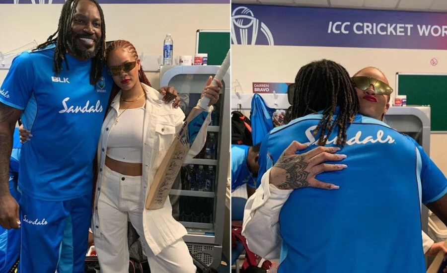 When @rihanna met the Universe Boss 🎤 🌎#CWC19 | #MenInMaroon pic.twitter.com/a5lt6fVIFx