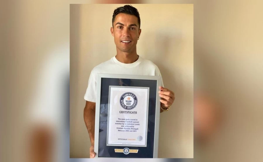 गिनीज वर्ल्ड रिकॉर्ड्स ने रोनाल्डो का अंतर्राष्ट्रीय फुटबॉल मैचों (पुरुष केटेगरी) में सबसे अधिक गोल करने का रिकॉर्ड बुधवार 1 सितंबर को तोड़ा. रोनाल्डो ने पुर्तगाल और आयरलैंड के बीच अलगार्वे स्टेडियम (पुर्तगाल) पर हुए मैच में ये रिकॉर्ड तोड़ा. ये मैच FIFA 2022 वर्ल्ड कप यूरोपियन क्वालिफॉयर के लिए खेला गया. रोनाल्डो ने इस मैच में 2 गोल किए. पुर्तगाल ने आयरलैंड को 2-1 गोल से हराया.