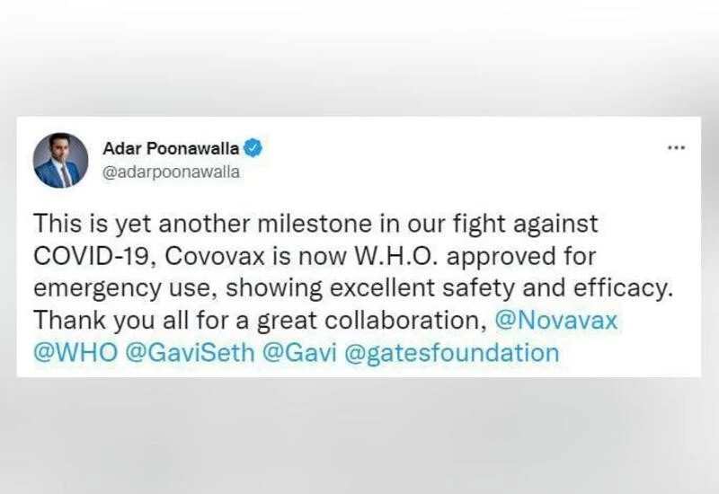 सीरम इंस्टीट्यूट ऑफ इंडिया के सीईओ अदार पूनावाला ने ट्वीट कर WHO की मंजूरी पर खुशी जाहिर की. उन्होंने लिखा, यह अभी तक कोविड-19 के खिलाफ हमारी लड़ाई में एक और मील का पत्थर है. कोवोवैक्स को आपातकालीन उपयोग की मंजूरी मिल गई है. उन्होंने WHO के इस सहयोग के लिए उसका धन्यवाद किया. बता दें कि SII ने कोवोवैक्स के निर्माण और आपूर्ति के लिए अमेरिका की बायोटेक कंपनी Novavax के साथ गठजोड़ किया है. WHO की मंजूरी से कोवोवैक्स कोविड-19 वैक्सीन की आपूर्ति में काफी विस्तार होगा. SII कोवोवैक्स की 1.1 बिलियन खुराक की आपूर्ति करने के लिए प्रतिबद्ध है.