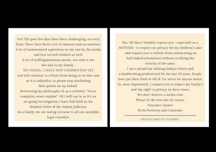 अपने बयान के अंत में शिल्पा शेट्टी ने लिखा, 'मैं एक कानून का पालन करने वाले भारतीय और पिछले 29 सालों से काम करने वाली प्रोफेशनल महिला हूं. लोगों ने मुझपर विश्वास किया है और मैंने कभी भी किसी का भरोसा नहीं तोड़ा है. तो मैं खासतौर पर आपसे निवेदन करती हूं कि मेरे परिवार और मेरे प्राइवेसी के हक का सम्मान करें और इस समय हमें अकेला छोड़ दें. हमें मीडिया ट्रायल की जरूर नहीं. कृपया कानून को अपना काम करने दें. सत्यमेव जयते.'