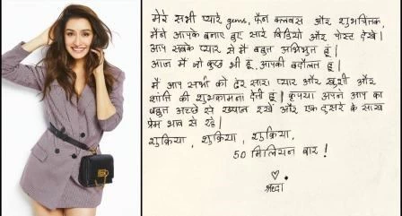 फैंस और उनके करीबी दोस्त श्रद्धा को 50 मिलियन फॉलोवर्स होने की शुभकामनाएं देने के लिए ढेर सारी एडिट्स, कोलाज और वीडियोज़ बनाएं है, अब श्रद्धा ने उन सभी को एक स्पेशल नोट के जरिए धन्यवाद दिया है।