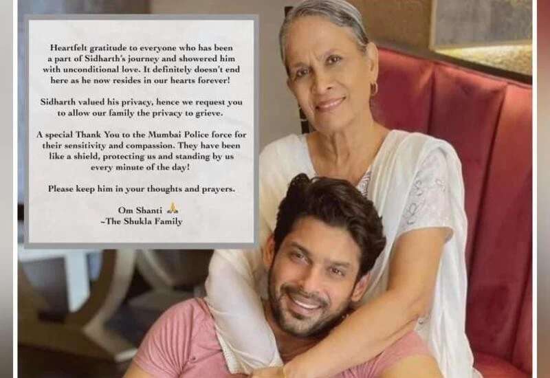 सिद्धार्थ शुक्ला के परिवार की ओर से कहा गया है कि ‘सिद्धार्थ की इस यात्रा में हिस्सा होने वाले हर किसी का हार्दिक आभार, बिना किसी शर्त के उसे इतना प्यार दिया। निश्चित रूप से यह इसका अंत नहीं है। वह अब हमेशा हमारे दिलों में है।‘