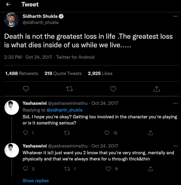 सिद्धार्थ के पुराने ट्वीट को इमोशनल फैंस ने कोट-ट्वीट करना शुरू कर दिया। “नहीं, आप इस समय गलत हैं भैया #सिद्धार्थ शुक्ल। मृत्यु जीवन का सबसे बड़ा नुकसान है। हमें लगा कि यह लाइन pls वापस आएं। अभी भी पचा नहीं पा रहा है कि आपने हमें छोड़ दिया, ”एक ने लिखा। "सच है कि मेरा एक हिस्सा आज मर गया और यह कभी भी पहले जैसा नहीं होगा," दूसरे ने लिखा। "कृपया, कृपया वापस आएं," एक तीसरे ने लिखा।