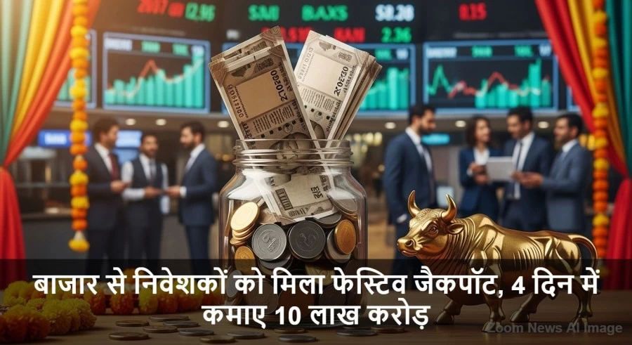 भारतीय शेयर बाजारों ने दिवाली के मौके पर निवेशकों को बड़ा तोहफा दिया है। सोमवार को लगातार चौथे सत्र में बढ़त दर्ज की गई, जिससे निवेशकों की संपत्ति। में चार दिनों के भीतर 10 लाख करोड़ रुपये से अधिक का इजाफा हुआ। इस दौरान प्रमुख सूचकांक सेंसेक्स और निफ्टी में 2 और 75 प्रतिशत से अधिक की तेजी देखने को मिली है।
