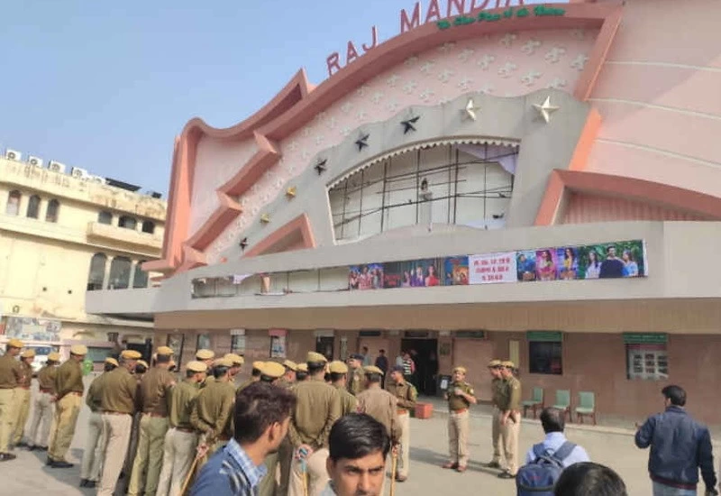 बीकानेर: यहां बड़ी संख्या में प्रदर्शनकारी एक सिनेमा घर के बाहर पहुंच गए। घबराकर सिनेमाघर का दरवाजा बंद कर लिया गया। बाद में मौके पर पहुंची पुलिस ने प्रदर्शनकारियों को समझा बुझाकर शांत किया।