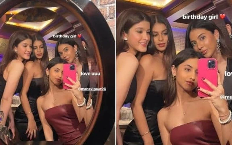 सुहाना के साथ शनाया कपूर, सुहाना की कजिन आलिया छिब्बा और सुहाना की दोस्त मानवी गौर हैं। मानवी के जन्मदिन पर सुहाना ने तस्वीर शेयर की है। सभी सेलिब्रेशन के मूड में हैं। सुहाना ने ब्लैक कलर का ऑफ शोल्डर ड्रेस पहना है। वहीं शनाया ने भी मैचिंग ब्लैक कलर का गाउन पहना है। सुहाना ने कैप्शन में लिखा- बर्थडे गर्ल। आगे उन्होंने हार्ट का इमोजी बनाया। साथ ही उन्होंने लव यू लिखा।