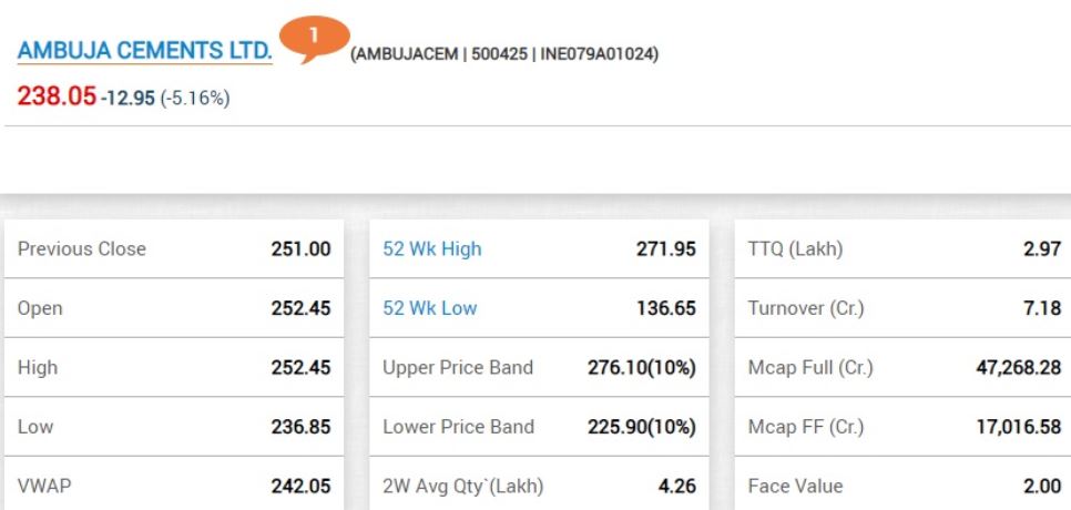 02:13 PM BSE में अंबुजा सीमेंट का शेयर 5% नीचे 238.05 रुपए के भाव पर कारोबार कर रहा है। शेयर दो महीने के निचले स्तर पर कारोबार कर रहा है।