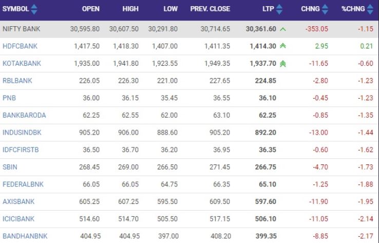 09:27 AM निफ्टी बैंक इंडेक्स में 353 अंकों की गिरावट है। इसमें बंधन बैंक और ICICI बैंक के शेयरों में 2-2% से ज्यादा की गिरावट है। दूसरी ओर HDFC बैंक का शेयर हल्की बढ़त के साथ कारोबार कर रहा है।
