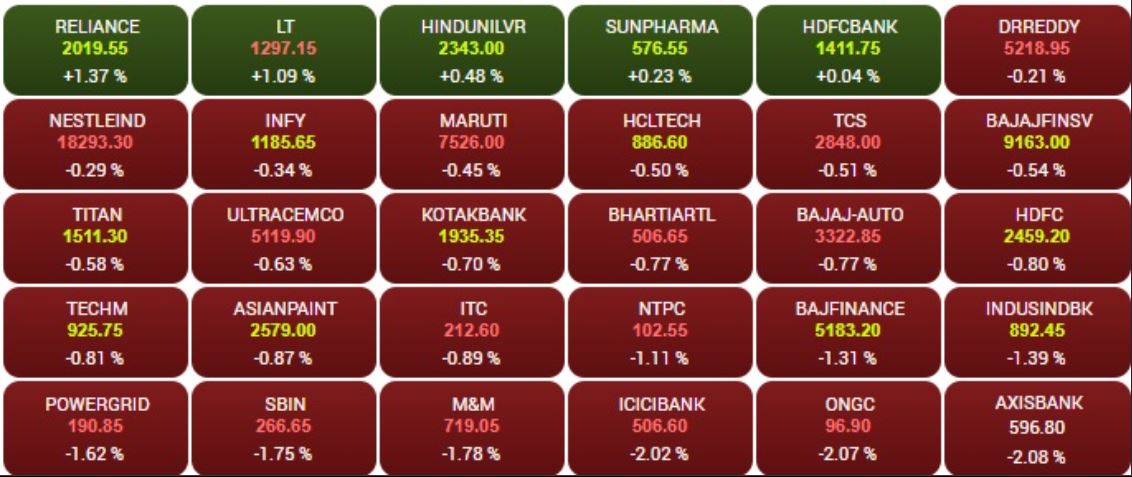 02:06 PM BSE सेंसेक्स में शामिल 30 में से 26 कंपनियों के शेयरों में गिरावट और 4 के शेयर हल्की बढ़त के साथ कारोबार कर रहे हैं। इसके ONGC का शेयर 6% से ज्यादा की गिरावट के साथ कारोबार कर रहा है।