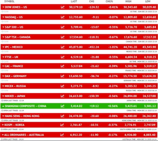 शुक्रवार को अमेरिकी बाजारों में सभी इंडेक्स गिरावट के साथ बंद हुए। डाउ जोंस इंडेक्स 0.41% की गिरावट के साथ 124 अंक नीचे 30,179 पर बंद हुआ था। S&P 500 इंडेक्स 13 अंक नीचे 3,709 पर बंद हुआ था। इसके अलावा नैस्डैक इंडेक्स फ्लैट 9 अंक नीचे 12,755 पर बंद हुआ था।
